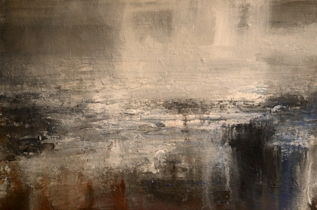 ← #Painting #MixedMedia on 60x60cm Canvas “The Rain fell for most of the Day, Looking out to Sea from the Life Guard Hut, #Porthcurno, #Cornwall”