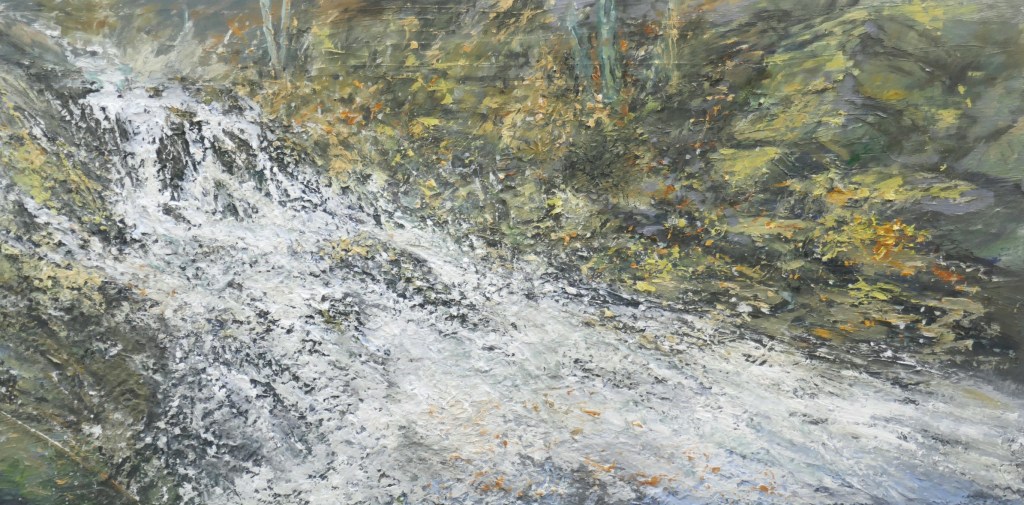 #MixedMedia #Painting on 100x50cm Canvas “Burbage Brook in Spate after more Heavy Rain over the Hills, Padley Gorge, #PeakDistrict”