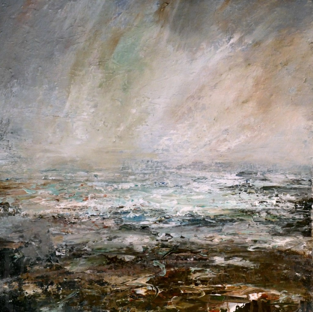 #Painting #MixedMedia on 80x80cm Canvas “Cold North Westerly Wind, but between the Showers Brilliant Light. High Tide #Porthchapel, #Cornwall”